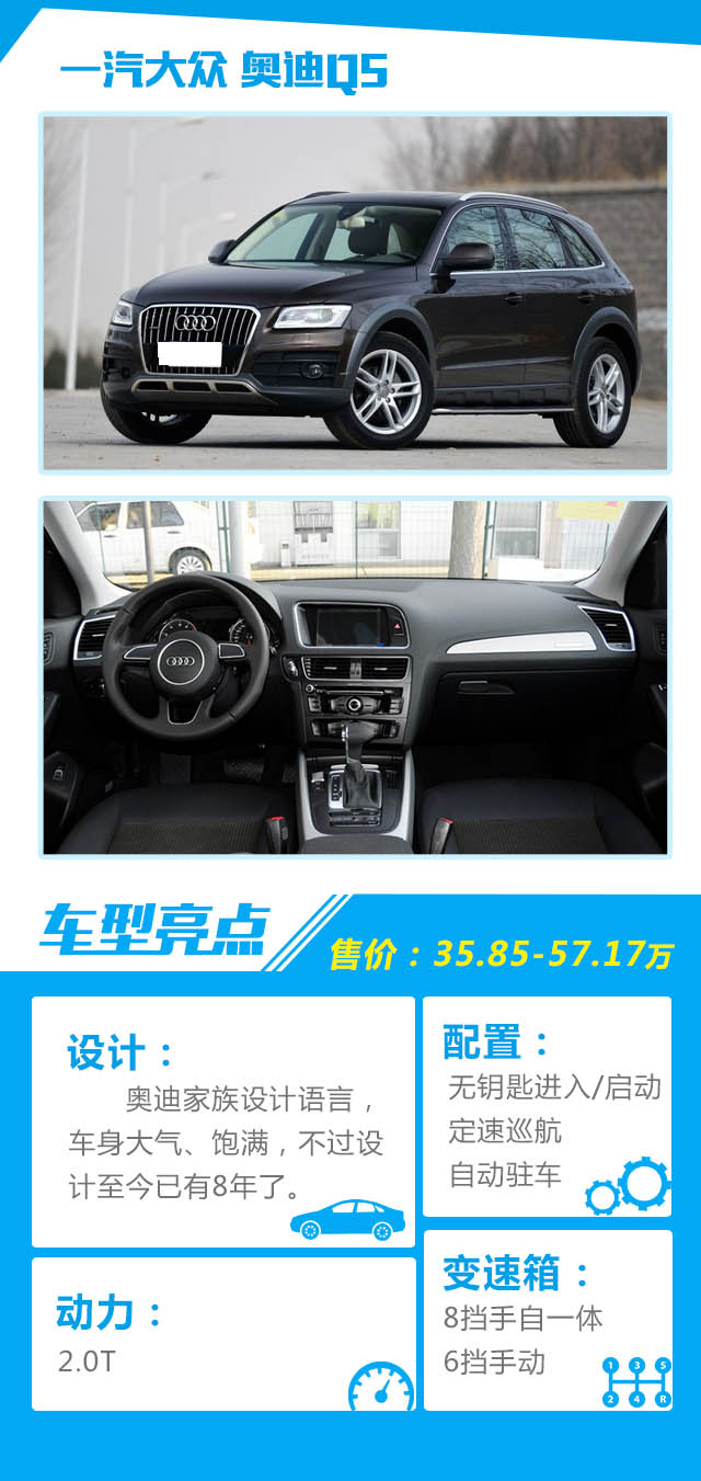 点评:奥迪Q5一直是这个级别车型的霸主地位,尽管车型已有8年之久,但依然很大气,很能让人接受,当然这与奥迪的品牌影响力有无可分割的关系,不过面对着竞争对手们一次次的冲击,Q5显然疲于应对,目前以大幅度的优惠在售,全新改款升级势在必行,当然奥迪也深知这点。