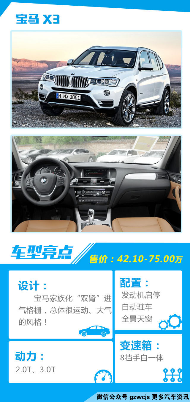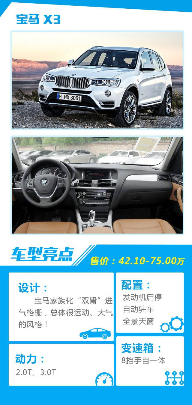 点评:上面两部车都已经合资国产,而宝马X3依旧采用进口方式销售,这也是导致X3性价比不是很高的原因,不过在未来一两年内X3国产是肯定的。不过,X3目前终端优惠价很有吸引力,对宝马的操控及品牌影响力有着深深信仰的同学可以考虑一下。