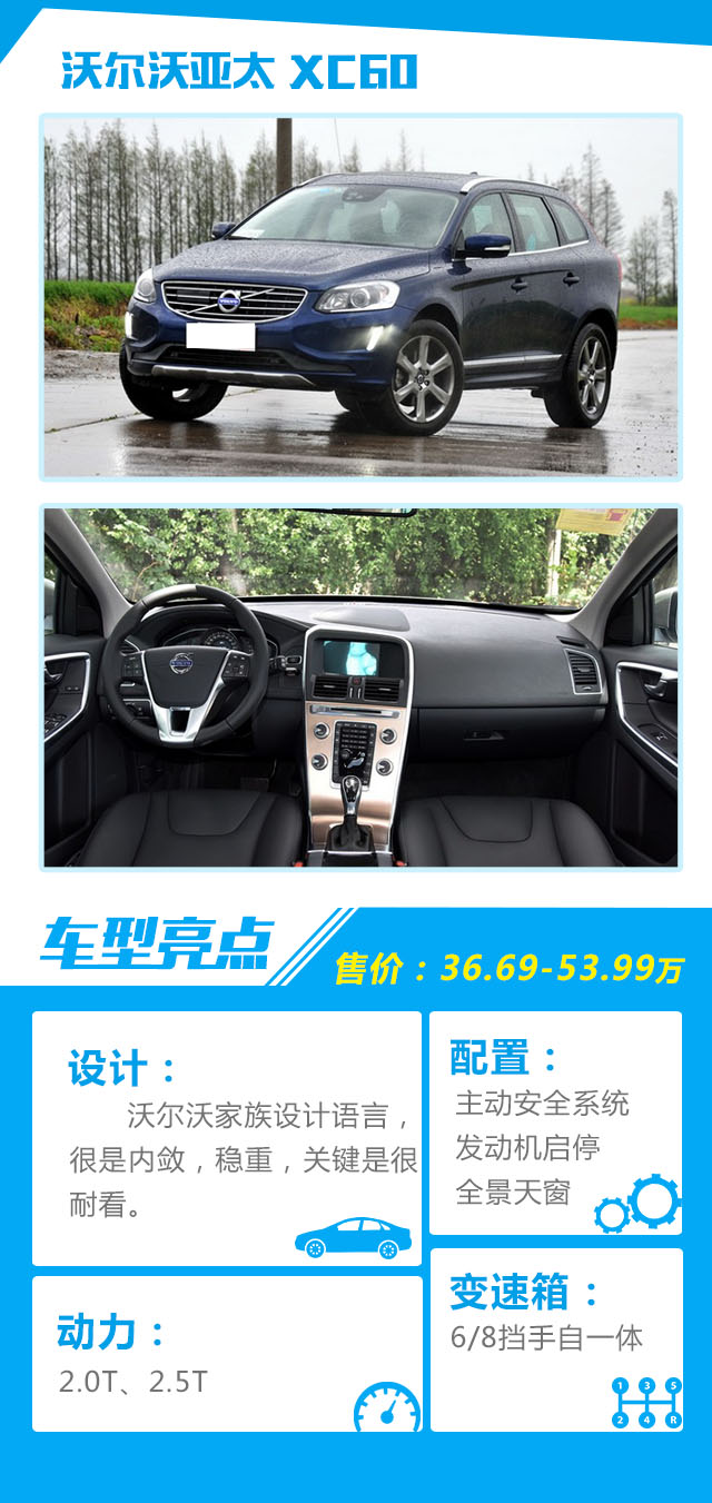 点评:沃尔沃这个品牌一直以来就被很多人熟知,在国人心中是安全性与舒适性兼具的代表,而当吉利汽车在2010年完成对沃尔沃的收购之后,就变得更有亲切感,也越来越符合中国人的消费观,除了内饰少了点豪华感外,XC60在安全性、舒适性、品质等方面都能令人相当满意,而且目前XC60市场优惠可不小,是入手北欧豪车的一大好时机。