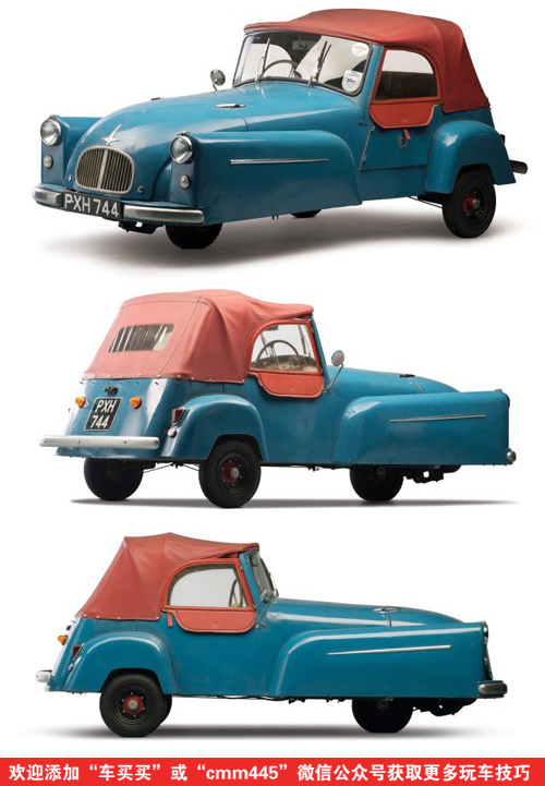 英国汽车制造商Peel因两项特殊记录闻名于世:第一,它曾经是马恩岛(Isle of Man:位于英格兰与爱尔兰间的海上岛屿)上唯一的汽车制造商;第二,由其出品的Peel P50至今还保持着全世界最小汽车的吉尼斯记录。而上图这辆Peel Trident则是P50的双人座版本。Peel的超小型车产均产于1962至1969年间。其中,P50只生产了50辆,Trident也仅有45辆。当时的售价为199英镑。今天,我们仅能见到少量遗留下来的Peel车型,其交易价起码要在10万英镑上下。