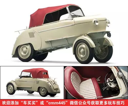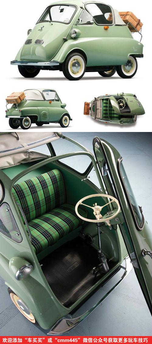 这辆来自于宝马的Isetta被可爱的称为“泡泡车”,1956年在德国慕尼黑出厂,它不仅可以满足人们从一点到另一点的出行需要,而且相比摩托车,它可以为人们遮风避雨,最为重要的是它的价格仅有2550马克,这只不过相当于德国工薪阶层半年多一点的薪水,任何一个普通家庭都可以轻松的拥有它。在进入市场的第一年,Isetta就卖出了一万多辆,这也使得西德当年的汽车生产量增长了三倍。 Isetta 250的车身长、宽、高分别为2285mm×1380mm×1340mm,轴距1500mm,这个尺寸比现在的smart还要小,这样的身材在城市行驶拥有着无可比拟的便利性优势。再加上前开门的设计,可以让你在停车时,可以将车头直接冲向路边,然后打开车门直接走入你要去的地方。