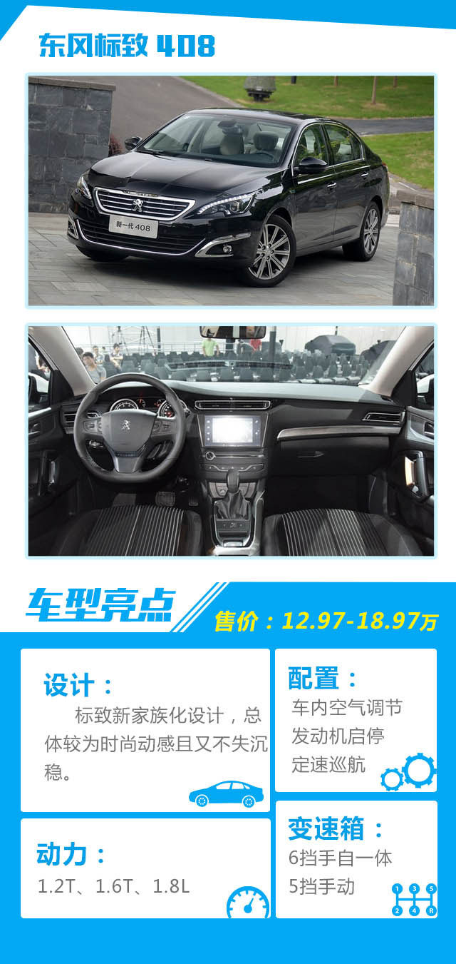 推荐车型:408一贯是以大空间著称,也受到很多家用消费者的青睐,而只是针对家用的话,建议购买1.8L 豪华版,价格14.97万,胎压监测、天窗、中控屏、自动空调、后座出风口等都是很实用的东西。