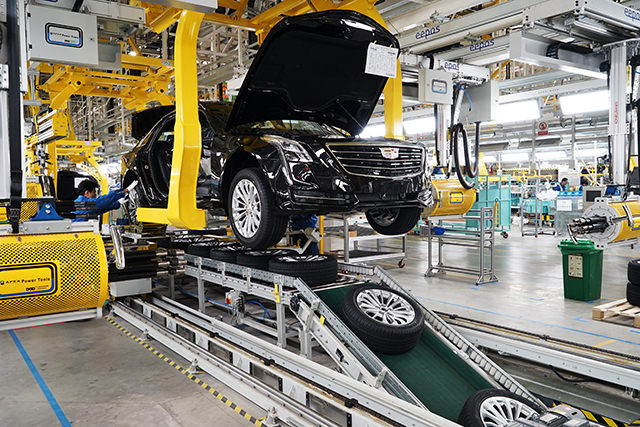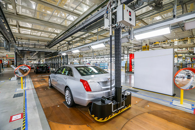 凯迪拉克工厂总装车间车间总建筑面积33,600平方米,主要由内饰预装线、内饰线、底盘线、终装线、门分装线、发动机分装线、最终检测线组成。集柔性、智能于一体,支持7款车型柔性总装。