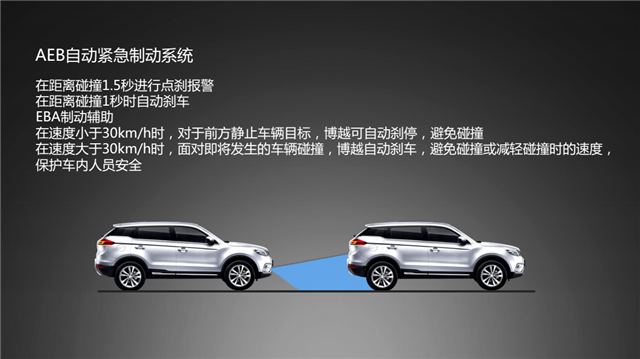 这个可以说是一个进阶的功能,就如大家所想的一样,吉利博越在主动安全方面的标准是向沃尔沃看齐的,这个AEB就是一个体现。主动刹车防止碰撞,并且根据车速做出不同的处理,速度小于30km/h时,自动刹停,避免碰撞;速度大于30km/h时,自动刹车,避免碰撞或降低碰撞时的速度,保护车内人员安全。现场实车“碰撞”体验时,也确实能做到准确的判断。