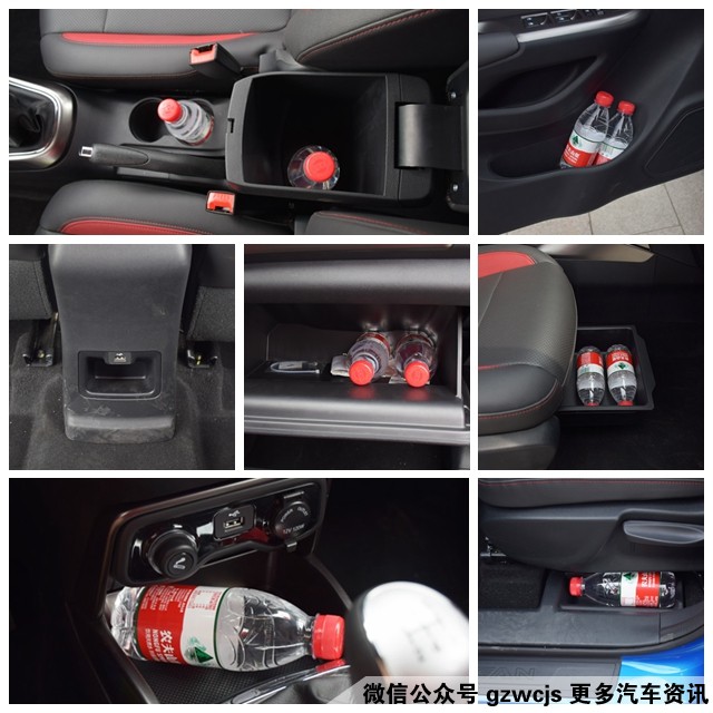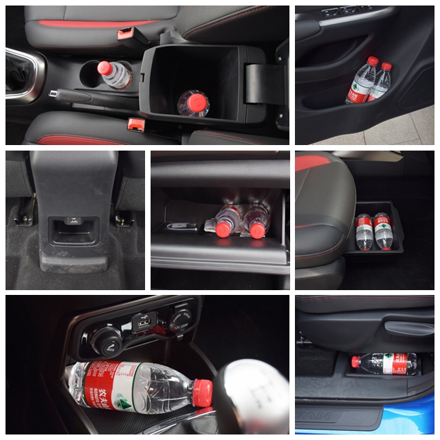 图中的参照物是有点甜矿泉水360ml装。扶手箱和手套箱的深度是刚好能够放下这瓶水,整个空间大概能放下4瓶。副驾驶位下面有一个塑料抽屉,方便副驾驶能够脱下鞋子放在里面,换上拖鞋享受旅程。而正副驾驶位旁边也有一个能放下一瓶矿泉水的储物格,估计是放手机什么的都比较方便。值得留意的是,挡杆前面有一个点烟器+电源+USB接口,而后排也有一个USB接口,旅途中根本不用担心手机没电或者要争电用。