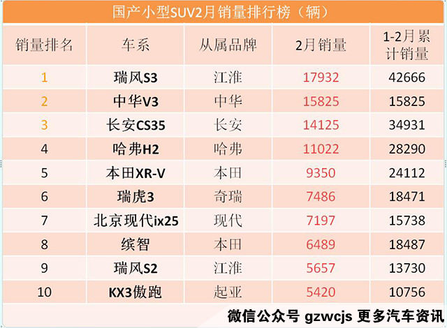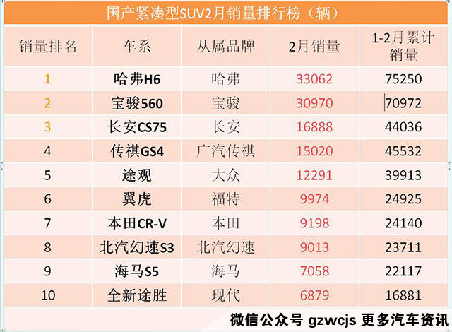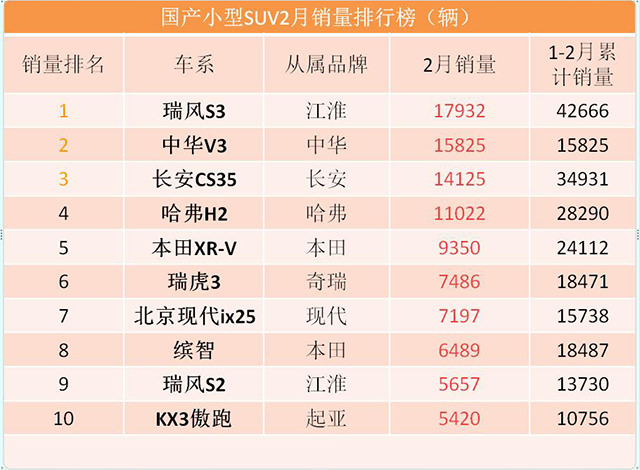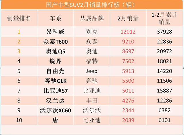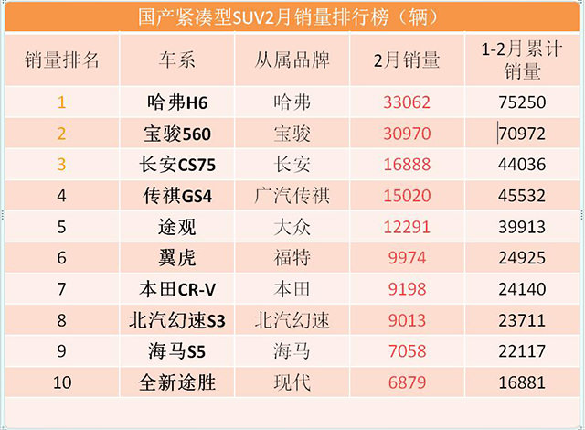 2016年2月份的SUV销量数据出来了,小编把各车型按照级别给列出排行榜,让大家一目了然,大众途观综合销量险被挤出前10(丫的活该,加价提车还要等),国产SUV已经崛起,看看你心仪的SUV有木有出现在榜单上吧!