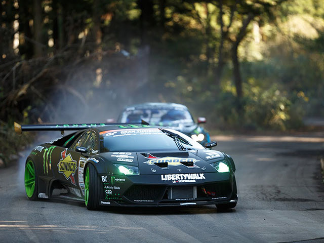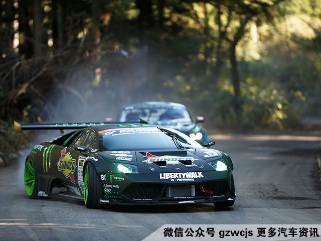 这两台外观涂装相近的赛车,一台是兰博的蝙蝠(Murcielago),另一台是野马(Mustang)。这两台车分属于斋藤太吾(Daigo Saito)和Vaughn Gittin Jr.