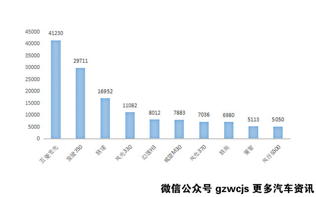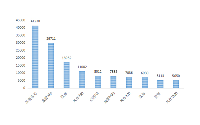 通过前十销量柱状图可以发现五菱宏光和宝骏730依然很火爆,欧诺和风光330也超过了1万,不过前十仅有四款车销量过万,说明目前的MPV市场依然不够热门。