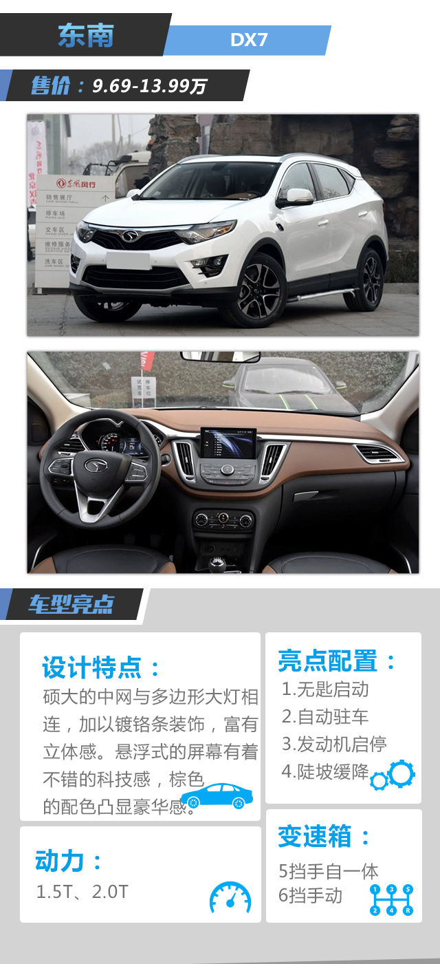 【点评】DX7的外观、内饰由意大利著名的设计公司宾尼法力纳所主导(主要客户为法拉利),颜值绝非一般的SUV可比拟。动力采用了三菱方面提供的1.5T、2.0T发动机,有着不错的可靠性。同时配上自动驻车、全景天窗等一堆的高逼格配置,完全击中年轻消费者的软肋。不过在装配的细节方面,DX7还有待提升一下。
