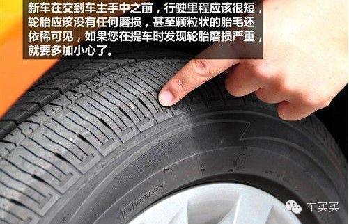 查看轮胎是否完好,轮毂是否干净、完美,没有凹陷、划痕。还应该询问或者实测胎压,保证轮胎处于正常胎压且四轮气压一致。此时,还应该从侧面推、拉轮胎上侧,感觉不松匡。如果是盘式制动器,还应该检查制动盘是否完好,不应有明显磨损和污物。