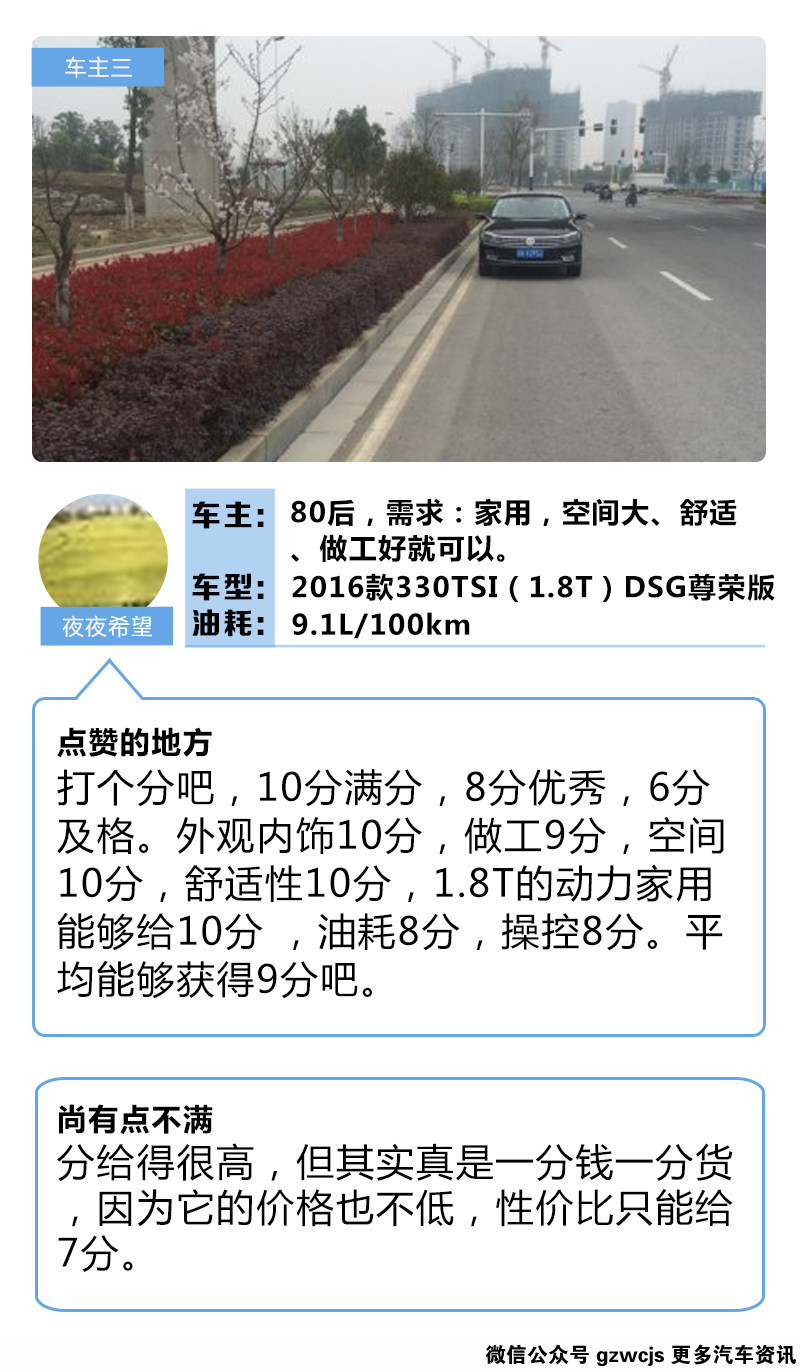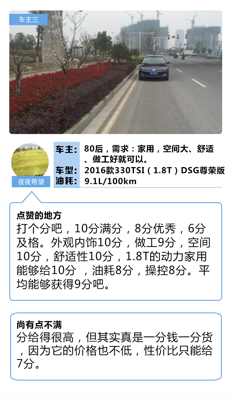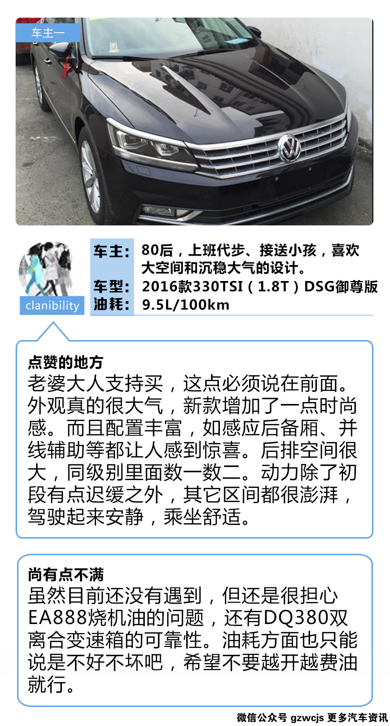 从几位车主的点评中我们可以看到,帕萨特最大的问题在于价格,价格比同级别其它中级车都要高上一个级别,这也直接导致了它的性价比比较低。但是,一分钱一分货,钱给足了,帕萨特也会给够车主们面子,它的各方各面都是那么的出众,以至于车主们不惜重金把它收入囊中。