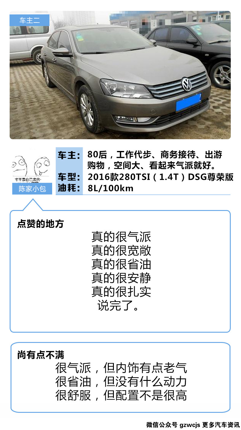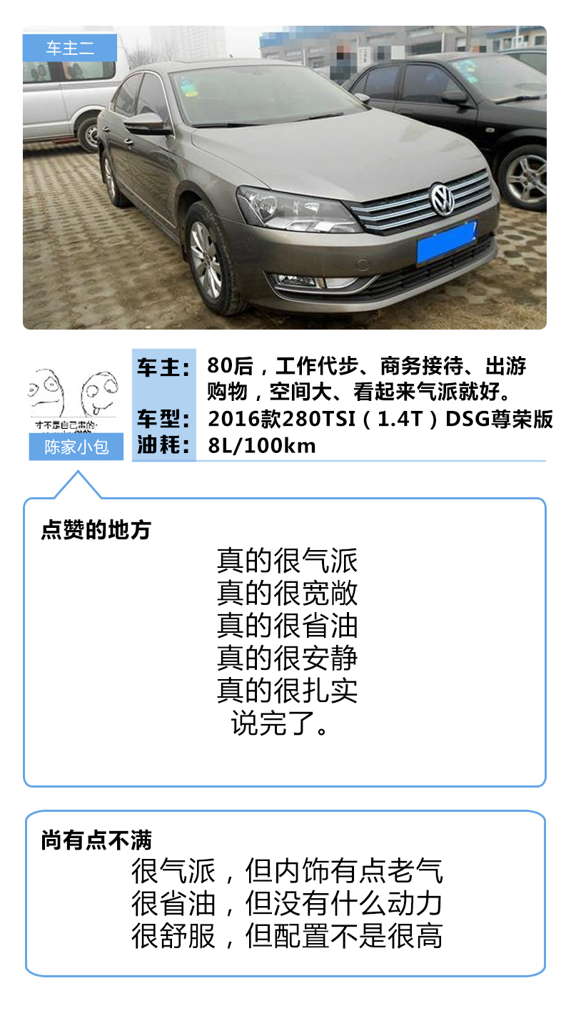 现在不管是什么车,都有很多选择,中级车有便宜的名图、雅阁,有超耐用的凯美瑞,有霸气动感的蒙迪欧,也有时尚感很足的迈锐宝XL和索纳塔九。不过教授身边有个朋友都没有选择这些,而是选了一款价格稍微偏高点的帕萨特,教授问他如此多选择为什么选了这款?他的回答竟让教授无言以对:中级车兼顾空间和动力就只有帕萨特和迈腾可选啊。这话说得真到位。事实上,买帕萨特的很多人也是这么想的,来看看其他车主的评价。