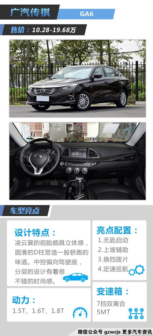 【点评】由国内顶尖设计师张帆主导设计的GA6,同样有着不错的颜值。不论外观还是内饰都能够与合资品牌相对标。同时GA6的底盘由阿尔法罗密欧166衍生而来,操控感更是同级当中的一流水平,但是它的价格只需要10万起哦!