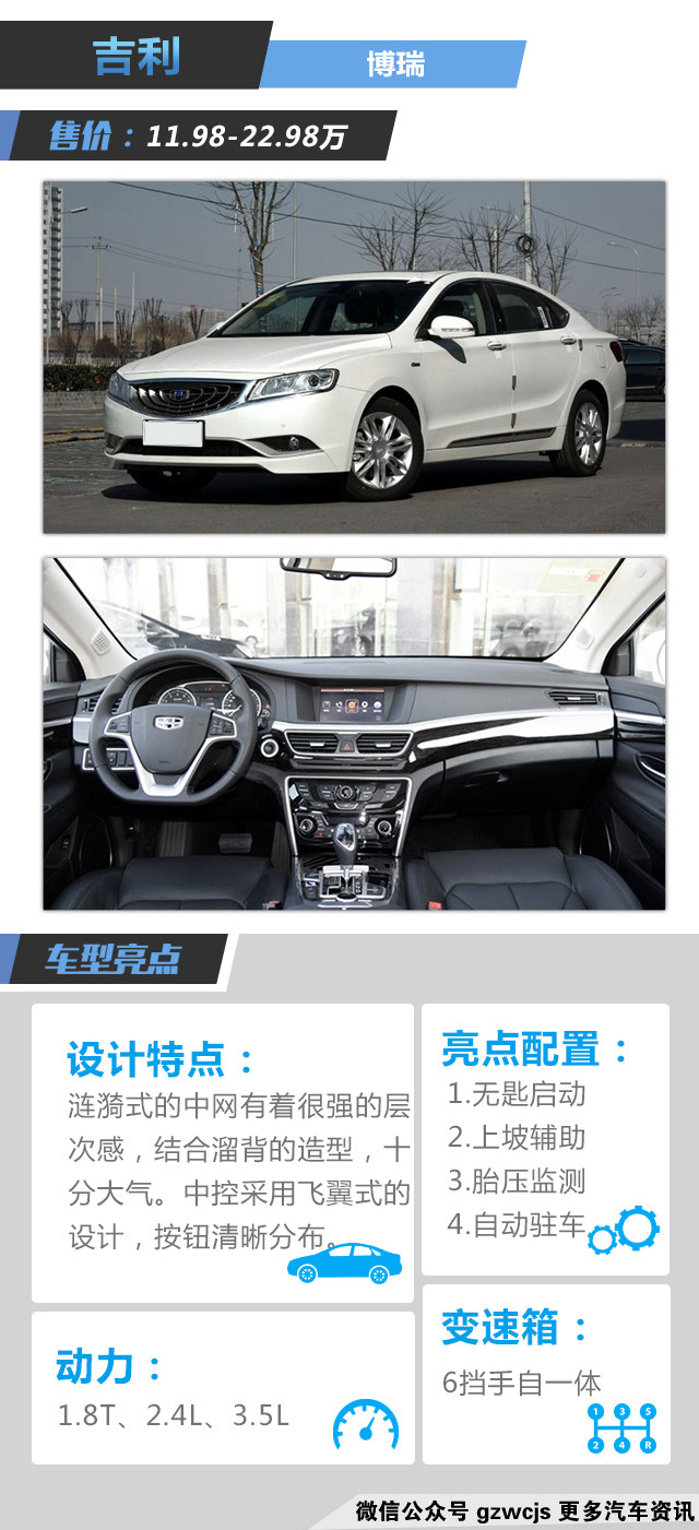 【点评】被大众评为“最美中国车”,博瑞的外观吸引力是毋庸置疑的。而更让人惊喜的是,博瑞的底盘十分扎实,调校有一股德系车的厚实感,配合出色的NVH隔音水平,乘坐的质感甚至能够优秀于合资品牌中级车。不过,博瑞的油耗水平确实需要优化一下了。