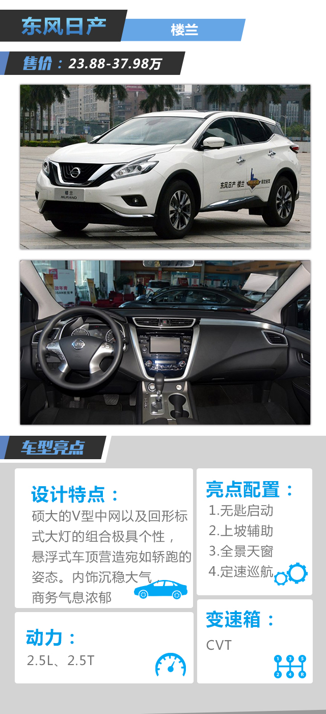 【点评】极度前卫的造型,宽裕舒适的车内空间,精致豪华的细节做工,要说楼兰这车还真挺不错的。只不过进口版的售价高达35万,要是它挂的是奔驰的车标那肯定没问题,只不过它是日产。不过国产后,楼兰老实多了,23万的起售价,一辆品质媲美豪华品牌的SUV就能够收入囊中了。
