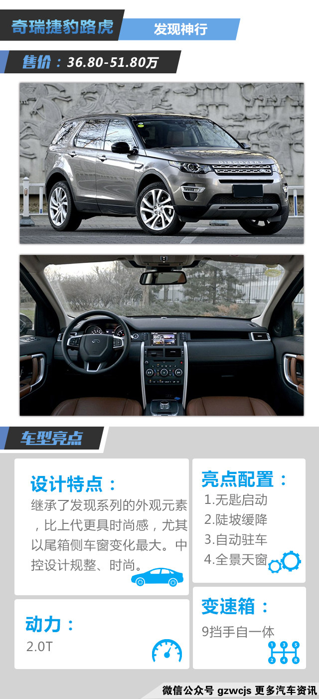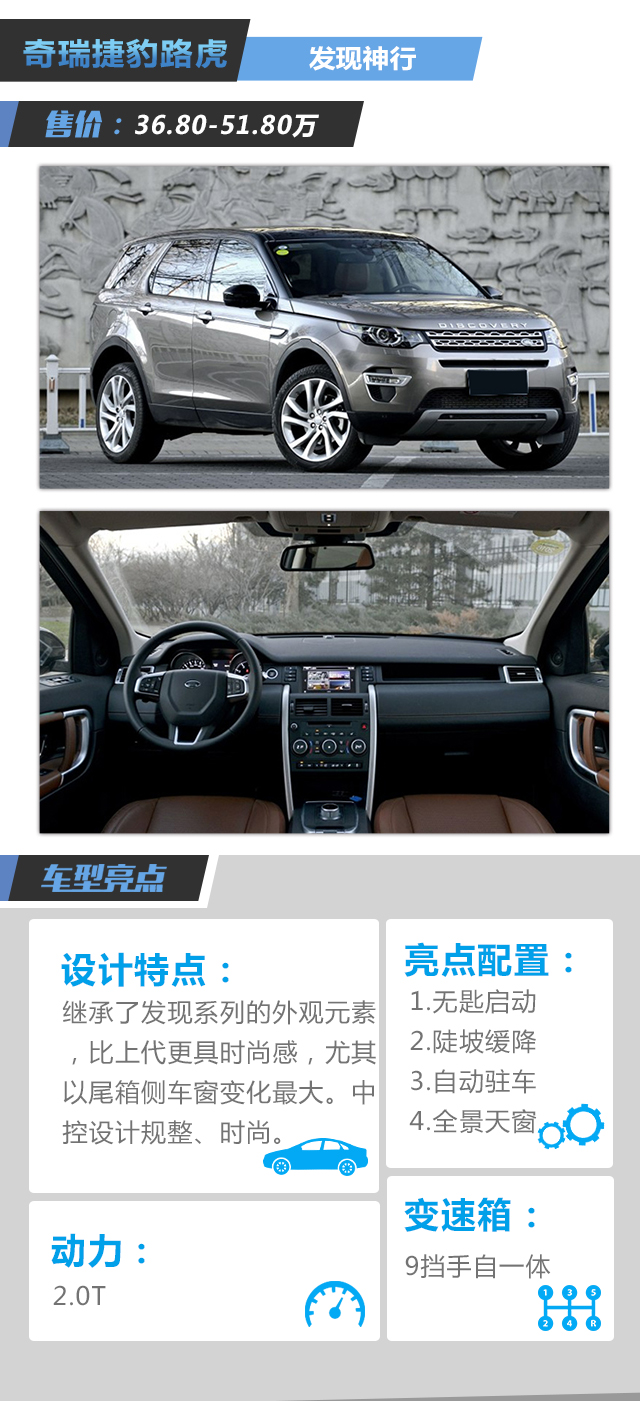 【点评】国产后的神行足足比进口版本便宜了14万之多,都能够顶上将近一半的价格。而且国产后,产品的质量依然很好地保持路虎的高水准,与进口版的区别更多地体现在后车尾累赘拖沓的奇瑞…车标。在越野性能完爆同级之外,神行还带有7座的版本,能越野能带娃,非它莫属了。
