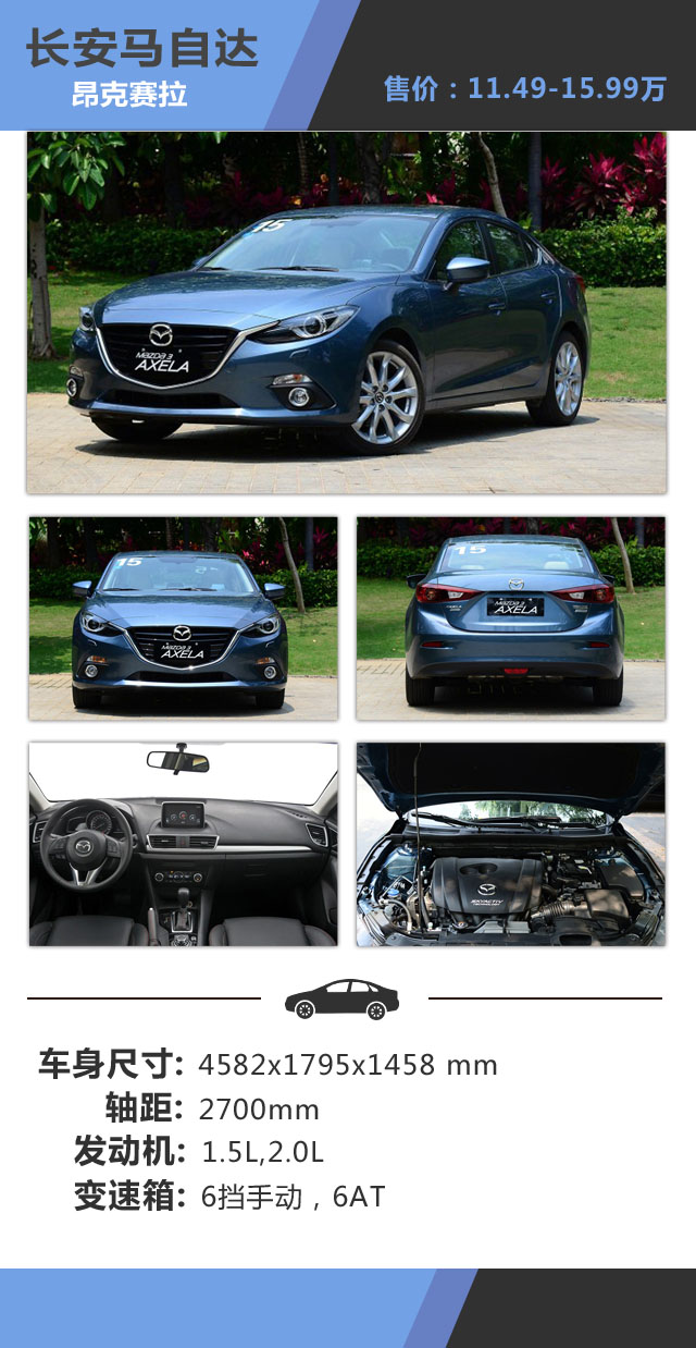 相比前两款,昂克赛拉是很适中的选择,拥有很有设计感的外观,较大的轴距,中控采用分层的布局,搭配大屏幕的设计可以吸引很多年轻人的眼光,采用创驰蓝天技术的发动机也拥有不错的燃油经济性,而其坚持的ZOOM-ZOOM的理念也让其拥有很不错的操控感受。