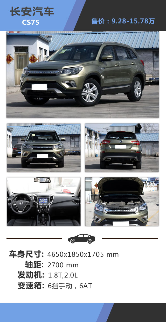 点评:长安CS75整体风格硬朗,大量的采用凌厉的线条,营造出一种肌肉感,前脸镀铬饰条与大灯一体化的设计,配上其硕大的标志,具有很好的辨识度,中控采用其家族化的布局,全黑的内饰搭配使其拥有良好的运动气息,对于喜欢家居风格的消费者选择较少。