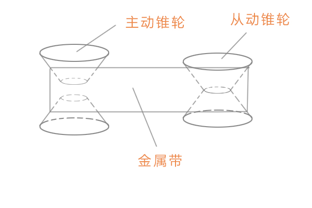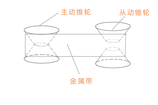 如图所示:左边的主动锥轮组间隔比较远,相当于变成一个小半径的“齿轮”,右边的从动锥轮组相距较近,钢带所围住的半径就大了,相当于一个大“齿轮”。如下图:
