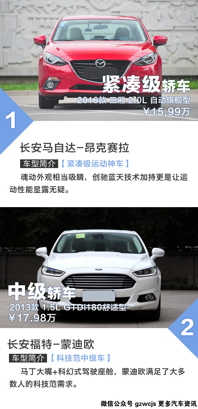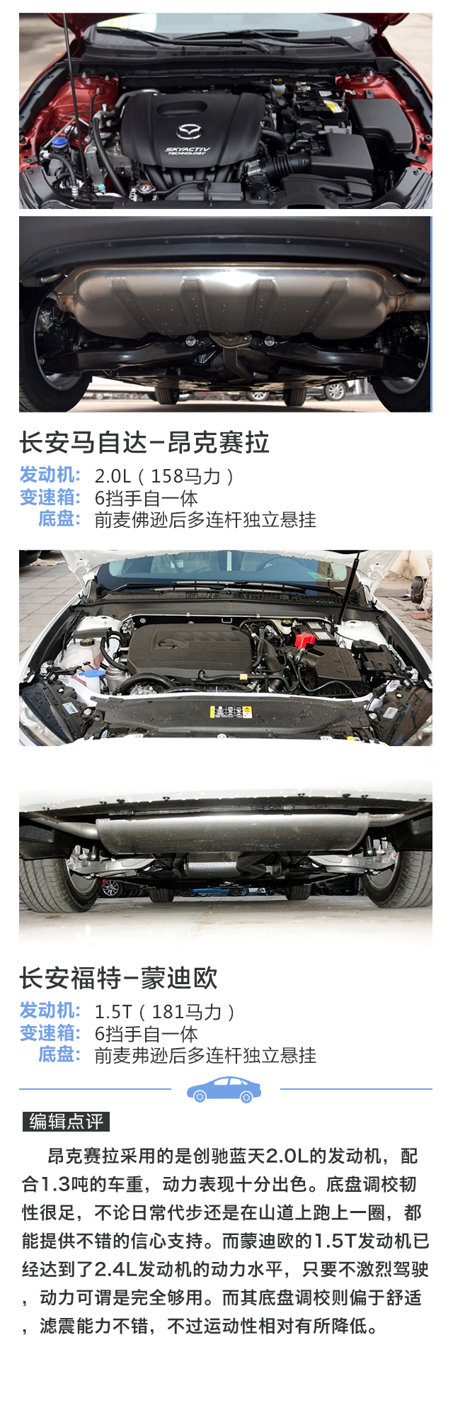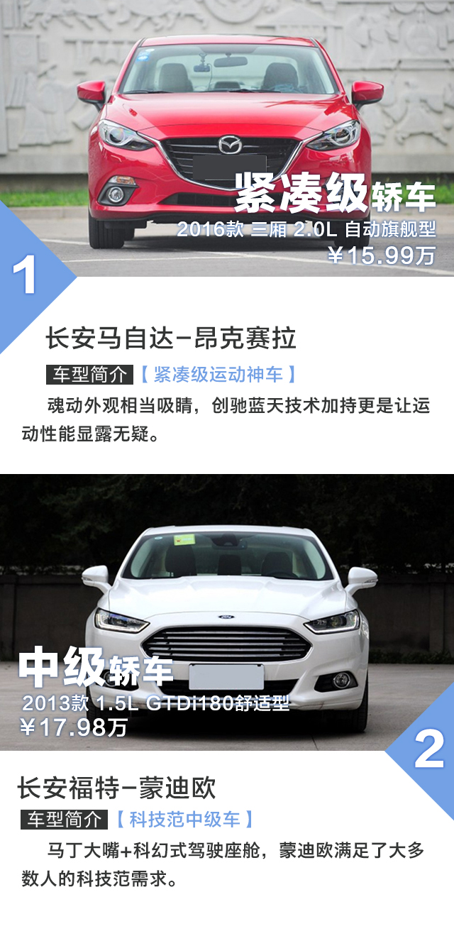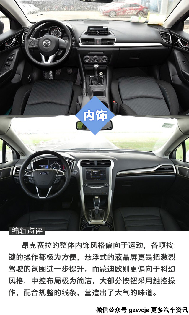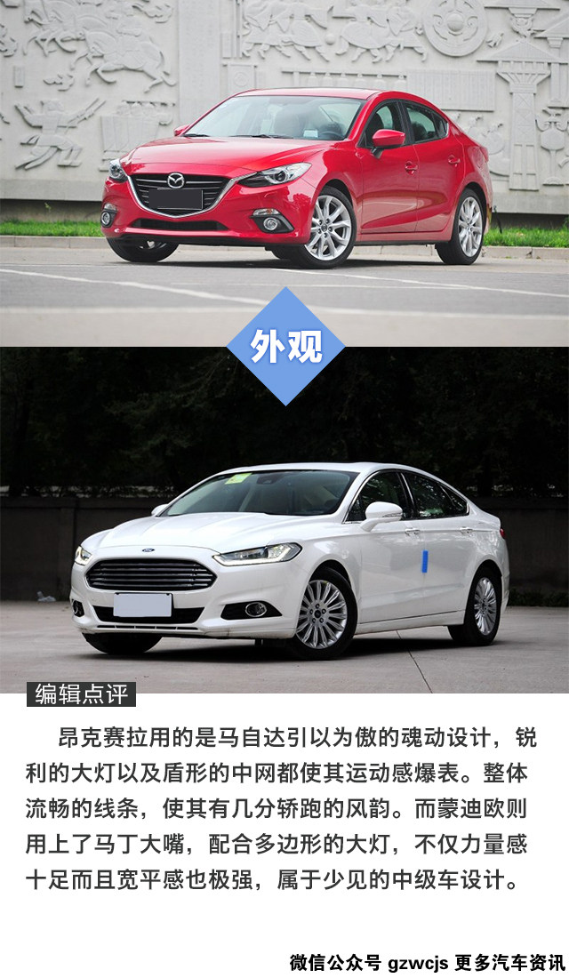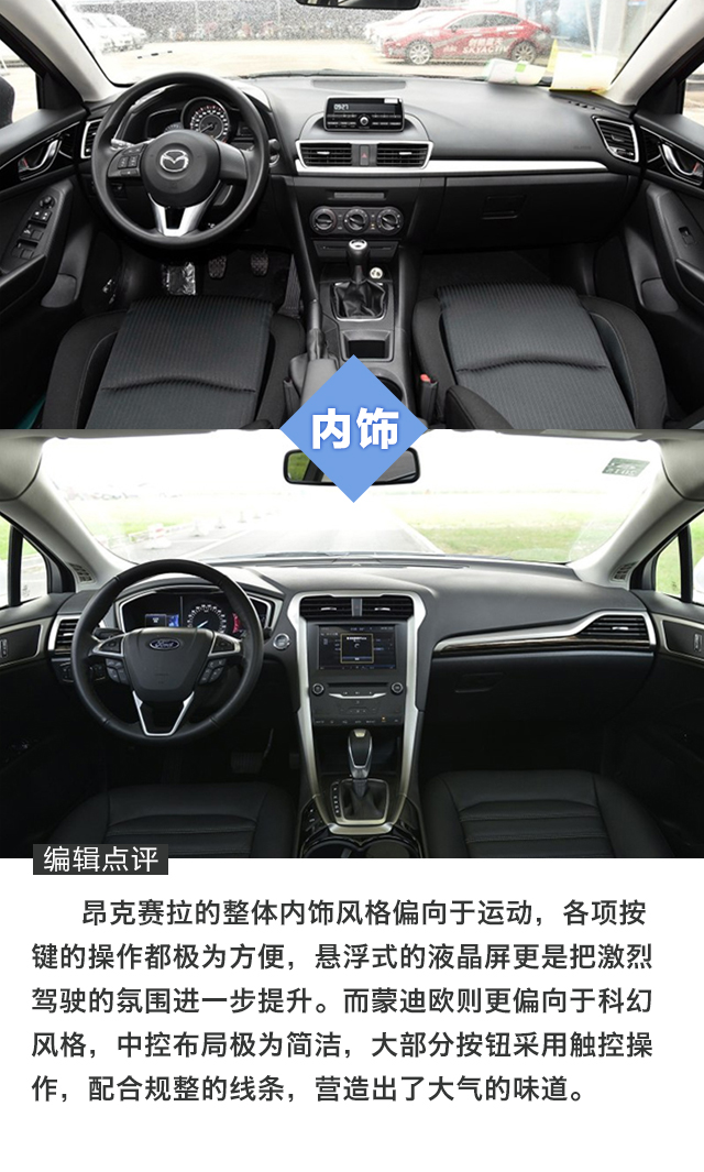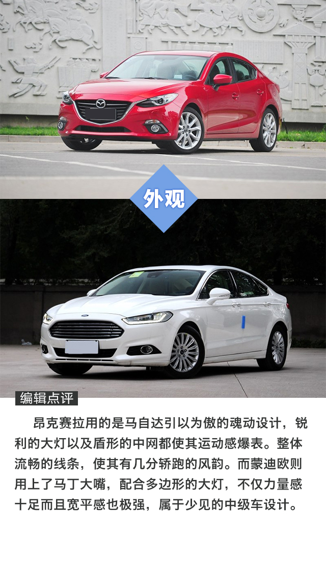 昂克赛拉一直是很多人心目中的Dream car,动力线性跟随的创驰蓝天发动机,调校韧劲十足的底盘,跟运动这个词前所未有地契合的一台家轿。当然,要开得爽,选择2.0L的版本是必须的。只不过看一看售价,怎么地也要15万以上。而纵观另一端,售价同样也在这个区间(优惠后)的阿斯顿蒙迪欧似乎也是挺有吸引力,马丁大嘴、科幻内饰设计,反正就是一台霸气外露的美系中级车。两台车的实力都如此出众,消费者又该怎么选呢?