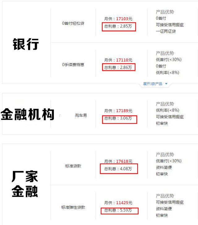 分别是银行、第三方金融机构、厂家自己的金融机构
