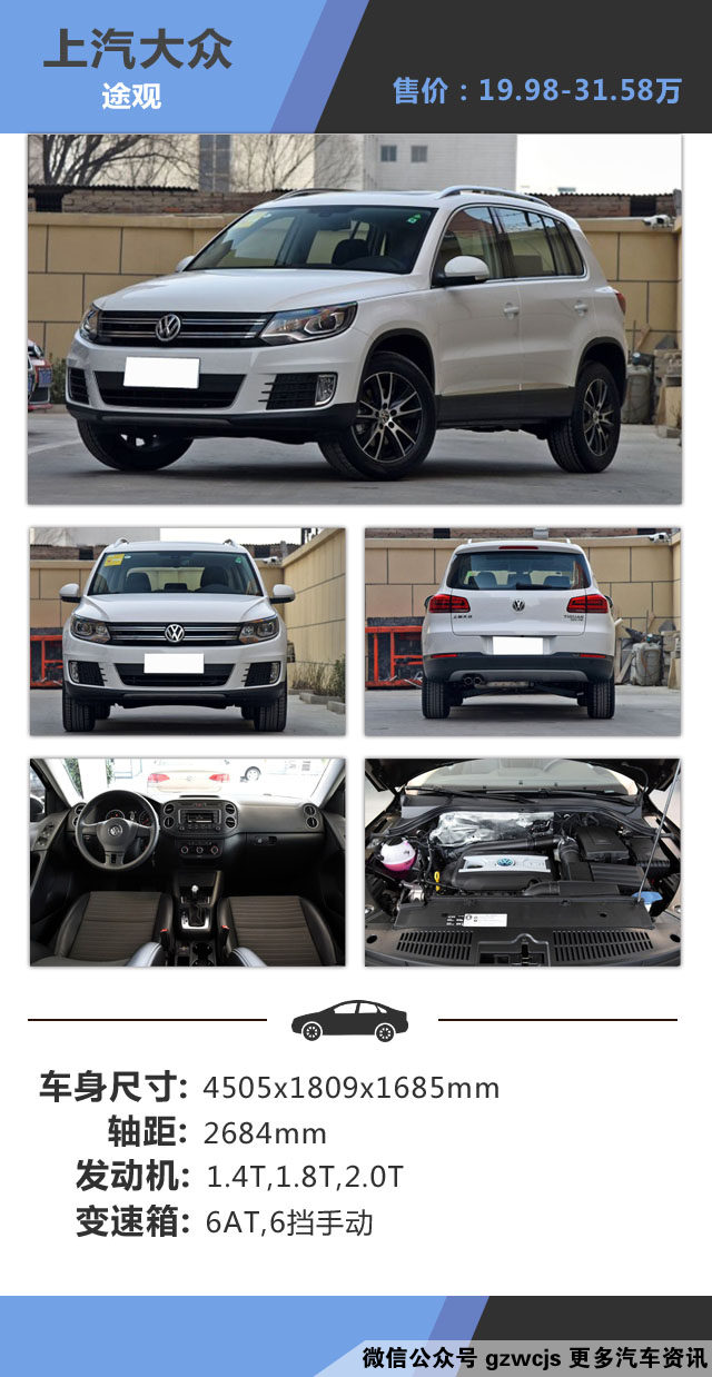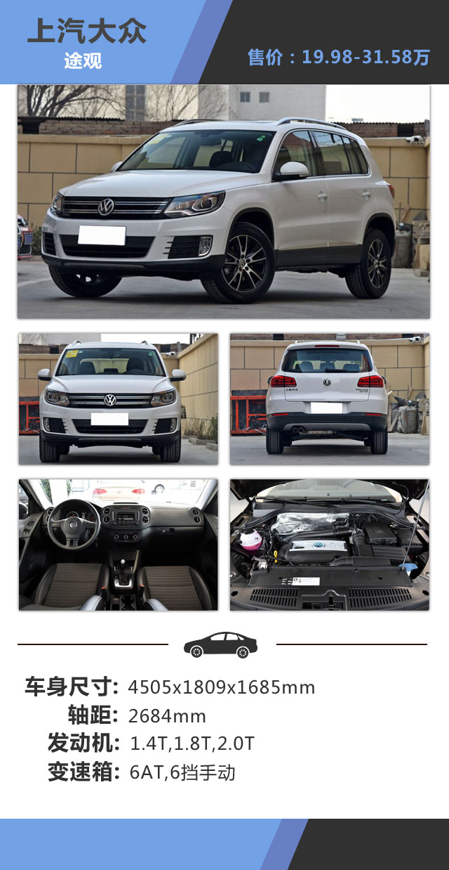 点评:途观虽然只是中期改款,不过其经典的造型非常的耐看,家族化的前脸设计,经典耐看,搭配新式样的大灯,造型更加的年轻醒目,中控依然是大众的风格,好处是上手没难度,用料上还是不错的,优秀的做工,使其拥有良好的质感,车内丰富的储物空间,物品的放置很方便。