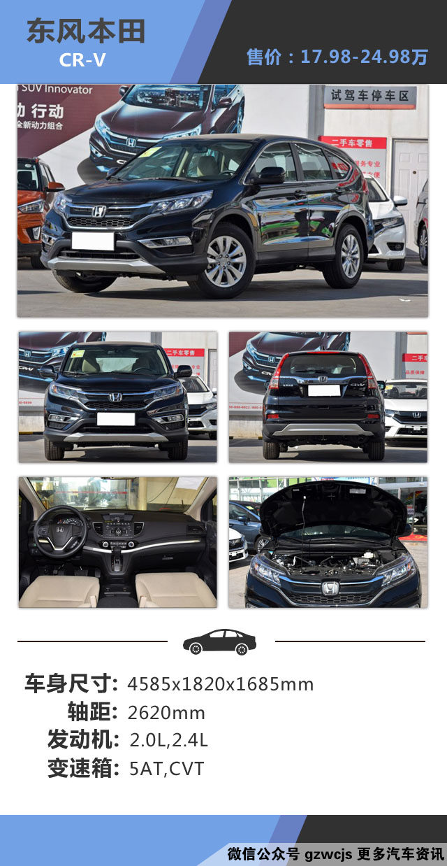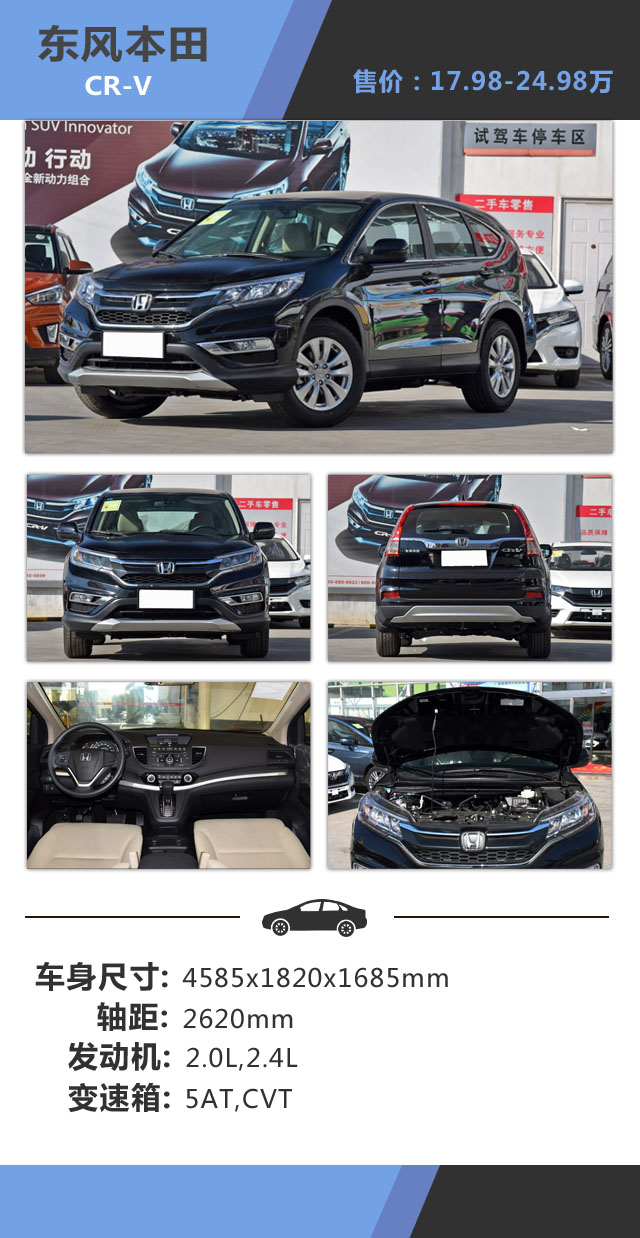 点评:CR-V采用家族式的设计,中网两条镀铬饰条与大灯相连具有不错的时尚感,前脸线条重新搭配,加上前保险杆银色的护板,整车少了一些老气,年轻化了很多,相对以前竞争力提升了,腰身线条与尾部没有太大的变化,依然是那么的耐看,中控与老款差别不大,一条贯穿中控的银色饰条营造出不错的质感,车内拥有宽敞的乘坐空间,储物空间也充裕,所以不用担心物品没地方放了。