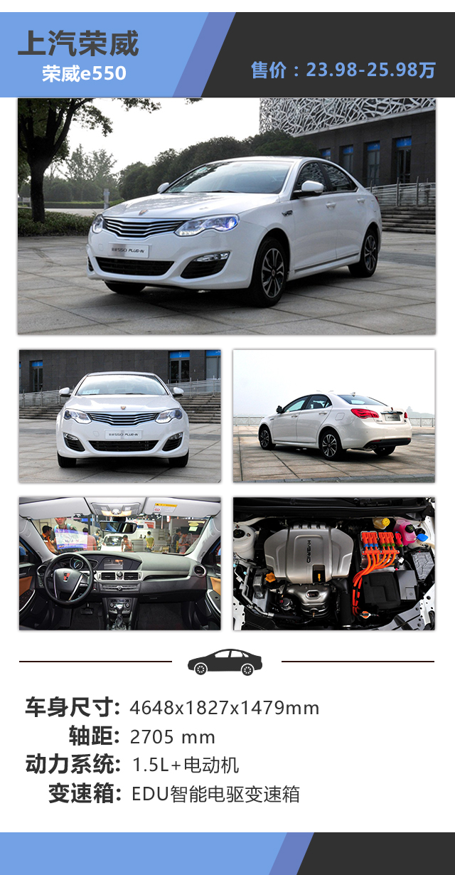 荣威e550是个不错的选择,效率颇高的自主研发的混动技术。前后独立悬架,开起来坐起来都比较舒服,电池底部布置不浪费后备箱空间。另外购买此车政策优惠多多,加上约10万元的补贴,高配18万左右即到手,性价比极高。