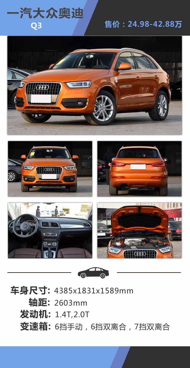 Q3作为奥迪的一台紧凑型SUV,时尚的外观设计,辨识度很高的灯光设计,加上优良的做工,特别是全系标配自动空调与自动启停功能还是非常实用的,目前推荐车型优惠可以达到3万左右,最后的成交价格也在25万左右,不过其后期保养较高会是消费者考虑的一个因素,相比之下X1作为宝马旗下的一款SUV,其拥有家族化的外观,豪华的内饰,同时还拥有着不错的驾驶感受,相对来说其将要改款了,喜欢新新鲜的需要等一下了,目前推荐车型优惠可以达到6万多,成交价格不到25万,喜欢宝马的可以考虑一下了。
