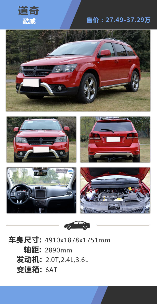 点评:道奇酷威作为一道美式前菜,前脸标志性的十字架的镀铬搭配经过熏黑的蜂窝状的进气格栅整个前脸相当的粗犷,车身多采用平直的线条设计,隆起的发动机线条都在宣示其肌肉感,一看就知道这是一台美国车,中控布局清晰,一道镀铬装饰贯穿其中形成不同的功能分区,厚实舒适的真皮座椅加上不错的做工,营造出很高的质感。