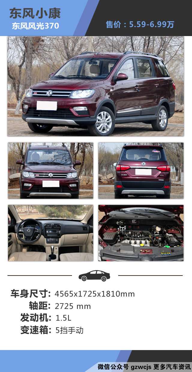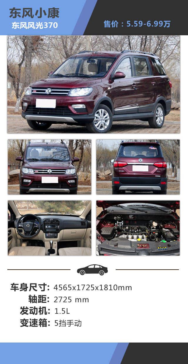 点评:风光370的前脸设计比较粗犷,整体造型有些偏向于SUV的风格,四条细长的镀铬饰条点缀着370的标志还是具有不错的辨识度,雾灯的造型很有特色,车身腰身的整体紧凑,悬浮式的车窗设计很有设计感,相信会很受消费者欢迎,中控的设计比较保守,采用T行布局,功能清晰容易上手,2725的轴距还是让其拥有不错的空间表现的,特别是其1810mm的车身高度让其拥有很不错的头部空间。