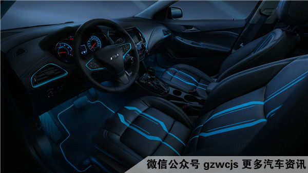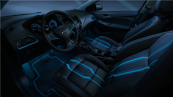 科鲁兹-创:战纪定制版的内饰延续了雪佛兰独有的双飞翼座舱设计,同时为了与外观设计相呼应,在座椅、仪表盘、方向盘、中控台等部位的细节处理中加入了炫蓝色光带,配以冰蓝氛围灯,将未来科技的迷人魅力展现得淋漓尽致。