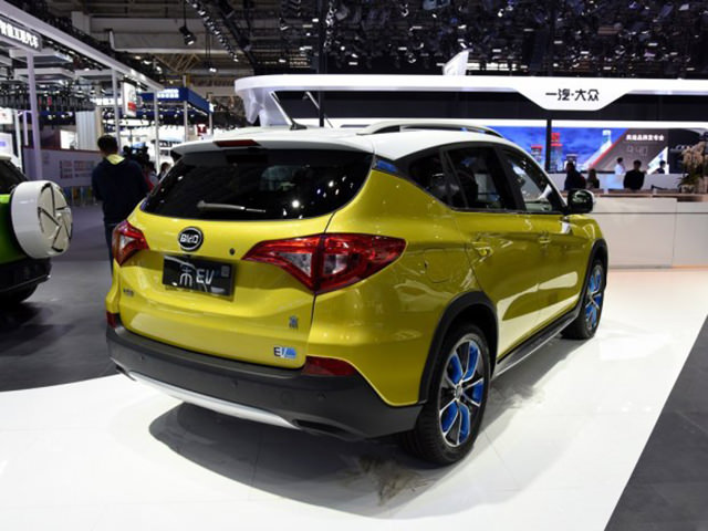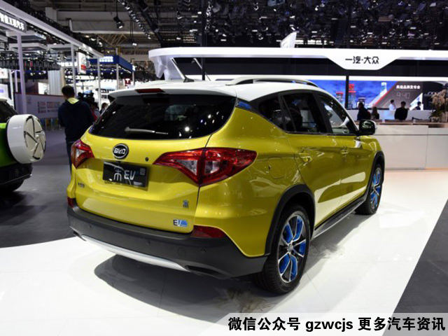 比亚迪宋EV整体造型和宋其他车型相同,但车顶采用了白色的喷涂,轮圈采用了蓝色装饰,新车尾部右下角采用了EV的标识,突出了其身份。