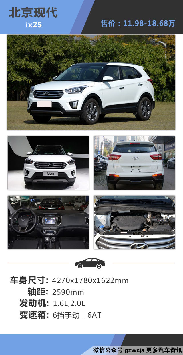 教授点评:ix25采用现代最新的流体雕塑的理念设计语言,整个前脸非常的时尚,六边形的进气格栅采用镀铬装饰很有质感,虽然只是小型的SUV,不过整车设计非常饱满,车身悬浮式的车顶绝对是其一大特色,非常的具有视觉效果;而中控方面其采用简洁的设计,用料也是比较讲究的,内饰多种色调的搭配也具有不错效果。