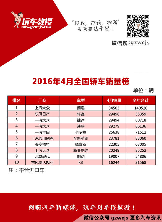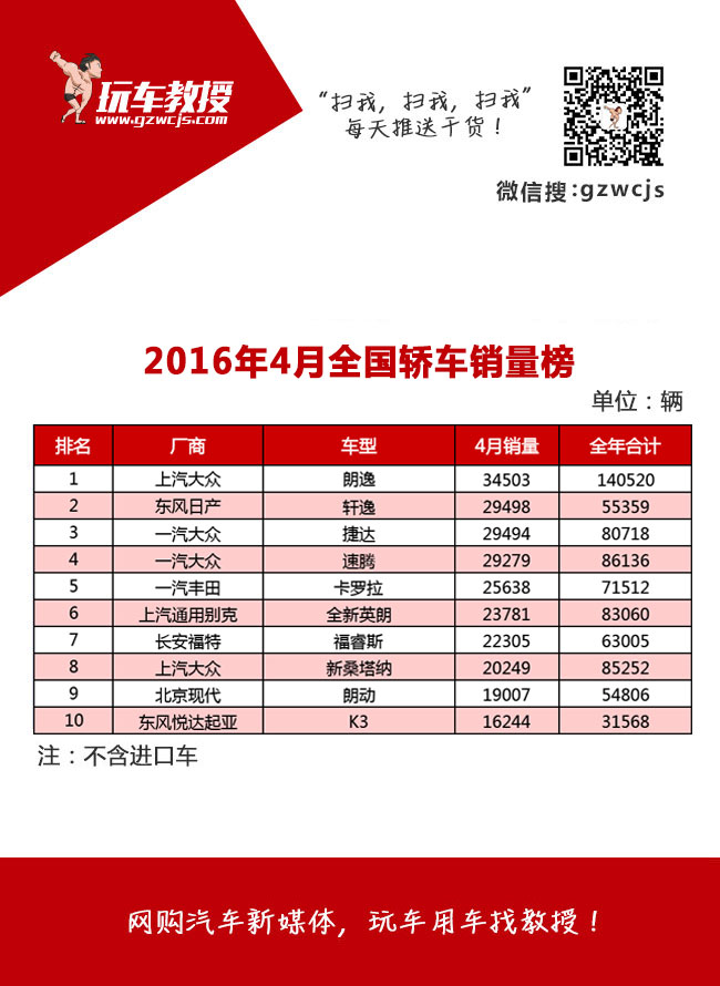 就在今天早上,乘联会公布了2016年4月份的乘用车销量榜单。教授看完了这份并不长的榜单,为大家统计出了十大畅销轿车的排名。看看你们喜欢的、正开着的排在哪个位置。