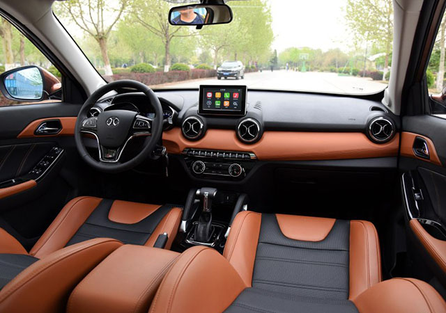 来到驾驶舱,还是看到了不少模仿的痕迹,借鉴了“奔驰”的设计,但是黑棕配色令人非常醒目,质感好;中控大屏相当实用,可连接手机,并且提供众多娱乐功能。