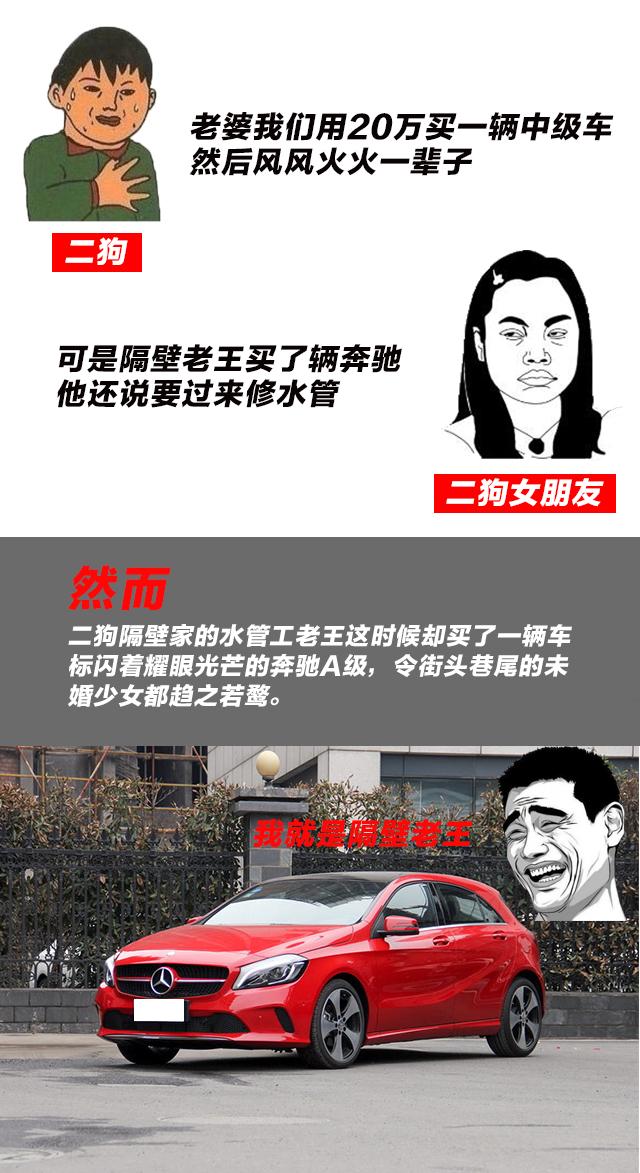 二狗是教授的朋友,通过辛勤的搬砖,得到了包工头的赏识,并且泡到了包工头的女儿。事业有成的二狗开始盘算着用20万储蓄,买一辆中级车开始自己风风火火的包工头女婿的人生。可二狗隔壁家的水管工老王这时候却买了一辆车标闪着耀眼光芒的奔驰A级,令街头巷尾的未婚少女都趋之若鹜。这时候,二狗的心开始泛起了一丝波澜,“用20万买一辆豪华车怎么样?”