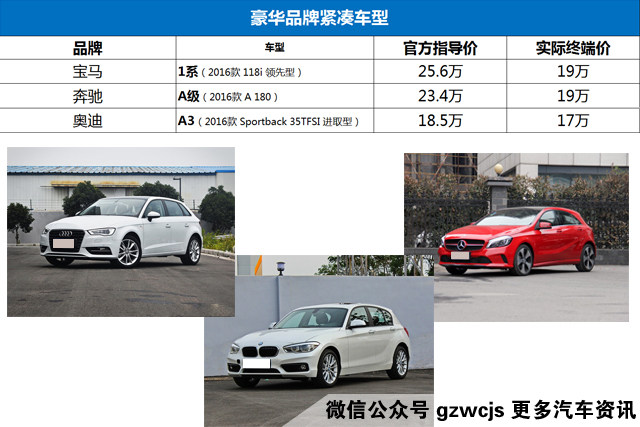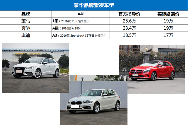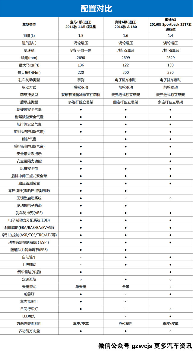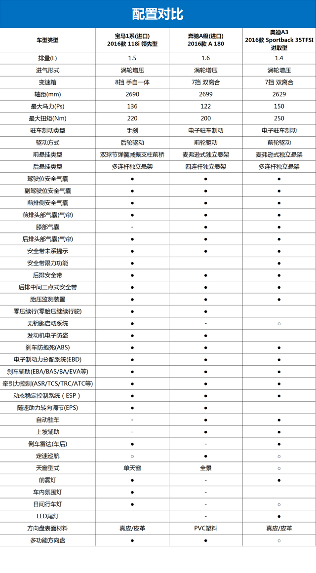 在上述的表格看到,20万的价格分别能够买到宝马1 系、奔驰A级、奥迪A3三款豪华紧凑车型,当然其三款也都属于低配版本。不过在低配的定义上,豪华品牌跟大众品牌有着不一样理解,其中的差别可以从配置窥探得到。