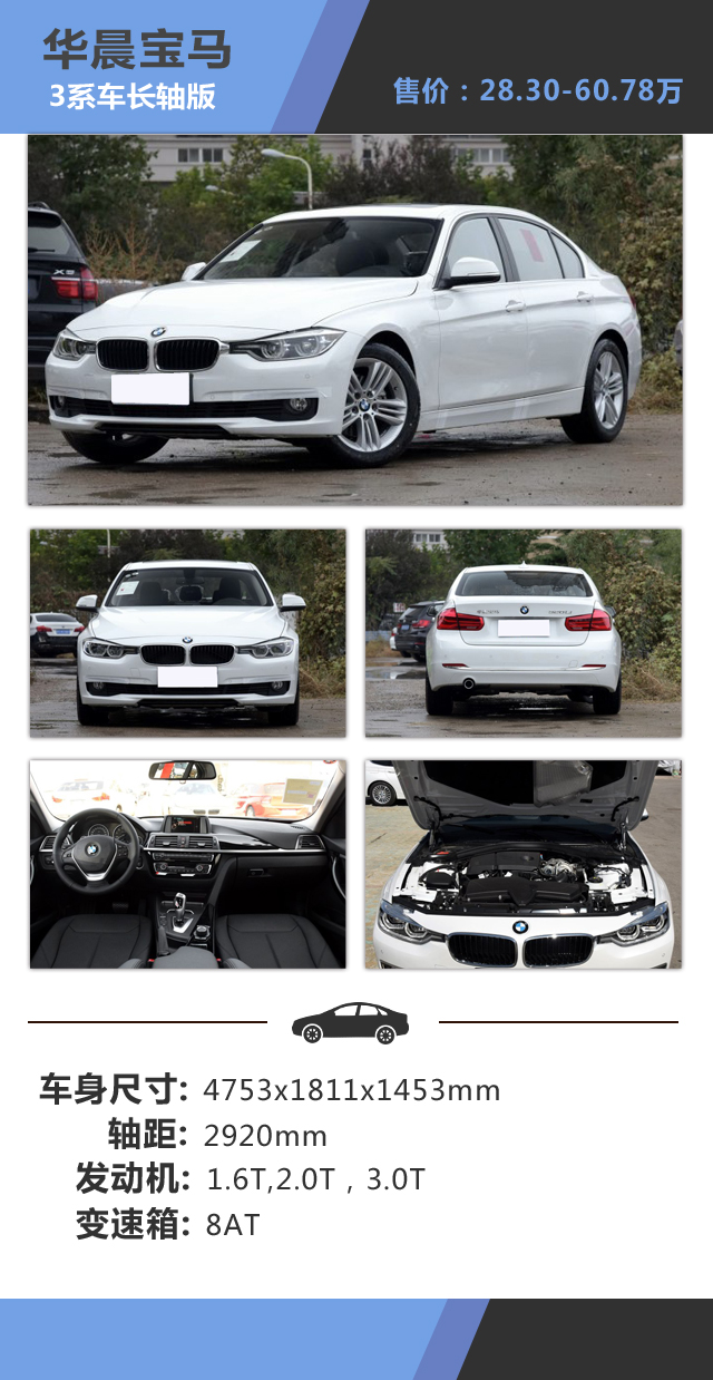 教授点评:宝马3系是这个级别当中最具驾驶乐趣的豪华车,应该很少人会反驳,虽然目前加长了轴距,不过拥有宝马的基因,大家不要担心其损失了其本来的运动特性,家族化的双肾造型拥有长久的历史,依然非常的耐看,开眼角的大灯设计使其多了一些犀利的气势,一体化的保险杠造型与镀铬装饰点缀显得更加的动感精致,而且低配版本与高配版本基本上没有太大的区别,就算买了辆低配面子还是很足的,不过唯一需要吐槽的就是作为一辆豪华车,低配版本的单出排气管确实气势弱鸡了很多,而内饰方面依然是宝马熟悉的布局,中间采用很长的镀铬饰条分隔开,具有不错的质感,不过看多了还是有一些审美疲劳,为了中国市场而加长的轴距,使其后排的乘坐空间也有了很多的进步