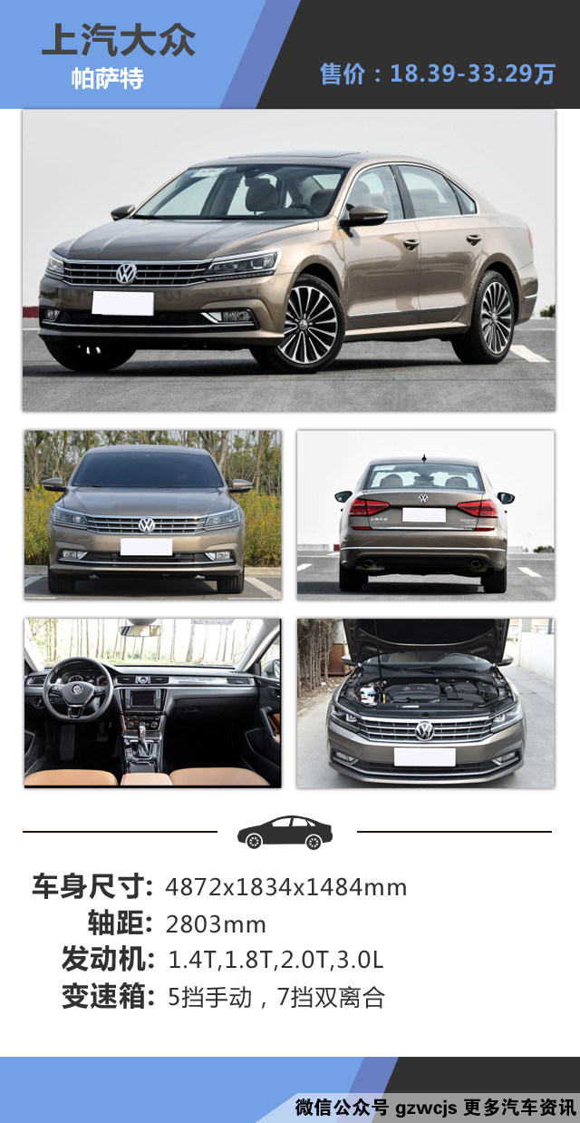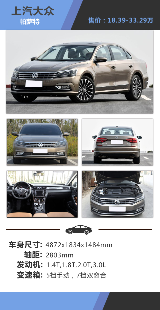 教授点评:帕萨特一直以来都是商务中型车的霸主,其时尚的外观设计充满浓郁的商务气息,虽然采用家族化的设计语言,不过前脸采用较多的直线线条设计,整个车身视觉非常的宽大,平直的镀铬饰条提升了不少的质感,流畅的车身线条依然非常动感,而饱满的尾部造型很符合其定位,镀铬饰条与前脸互相呼应,而车内则兼具豪华与精致,中控上的时钟也大大的提升档次感,作为一台中级车,其后排的乘坐空间还是相当的宽敞的,日常当中作为商务出行,接待客户面子还是杠杠的。