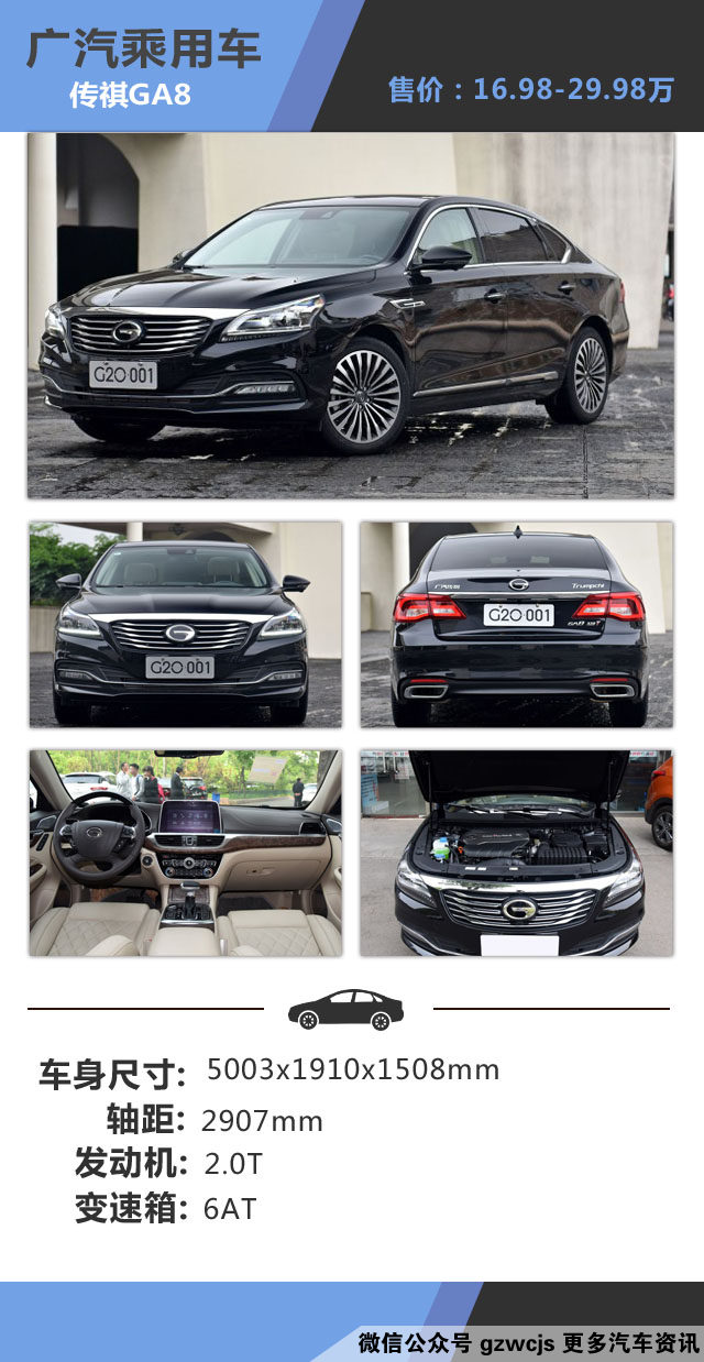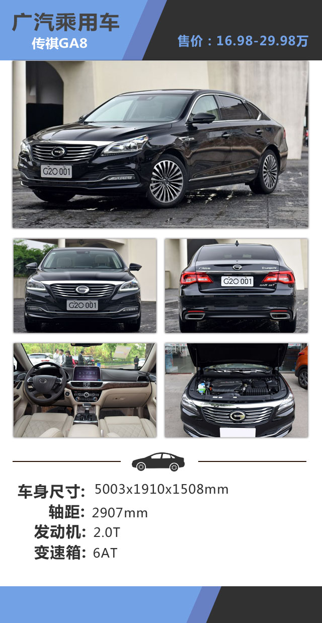 教授点评:GA8是传祺推出的第一款中大型车,超过5米的车身显得整车非常的宽大修长,同时相对旗下的众多车型,少了一些犀利,多了一些从容优雅,气派的前脸多采用平直的线条设计,整体显得大气,而且车身的线条设计流畅自然,不会显得很臃肿,车尾则相对平淡一些,造型有些普通。来到车内才是其凸显功力的时候,浅色调的内饰设计搭载木纹装饰的点缀营造出豪华优雅的气氛,同时大面积的拼接真皮座椅视觉效果非常好,加上颇为精致的做工,整体的水平更进一步,同时其还可以选择4座版本,对于商务有需求是很好的选择。
