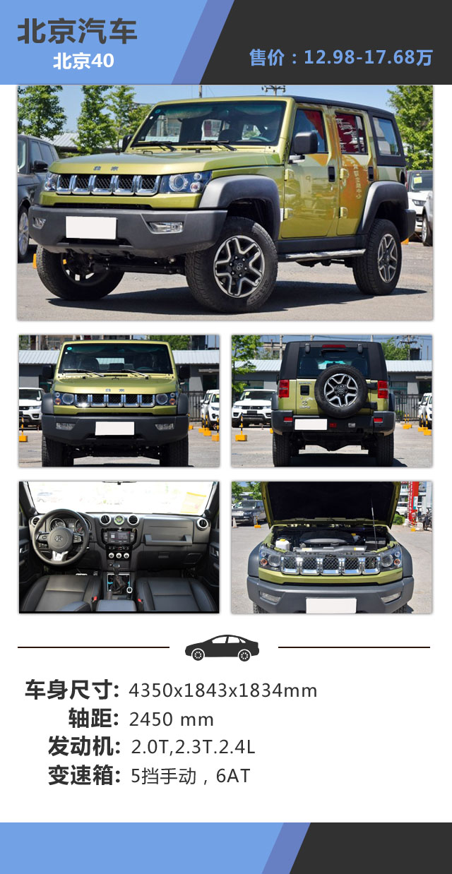 教授点评:北京40就是一辆很纯粹的硬派SUV,其拥有方正的车身设计,前脸采用了中国元素的设计,进气格栅的设计灵感来自于长城上的城垛,5个U型的开口搭载被镀铬包围质感真的很不错,圆形的大灯机构具有很高辨识度,而车身的的设计则比较平直,其车顶依然可以手动拆卸,具有不错的乐趣,车尾部分能看到硕大的备胎外挂,越野味道更浓郁。