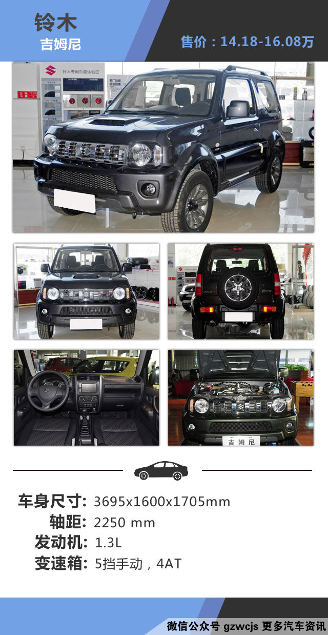 教授点评:15万左右你能买一台纯粹的进口越野车是什么?这就是今天的答案,铃木的吉姆尼,拥有短促的车身设计,硬派的车身造型,一切的设计都只是为了越野服务,其整体外形犹如一台缩小的JEEP,Q版的头灯设计以及有些圆润的车身线条以及越野车横开门设计让人觉得是人们的一台大玩具,车内的设计则比较的简单,显得有些廉价,由于车身宽度不大,横向空间比较局促,其两门版的设计也是为越野设计,后排要载人还是不要奢求太多了。
