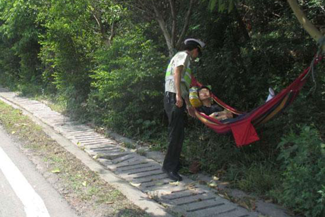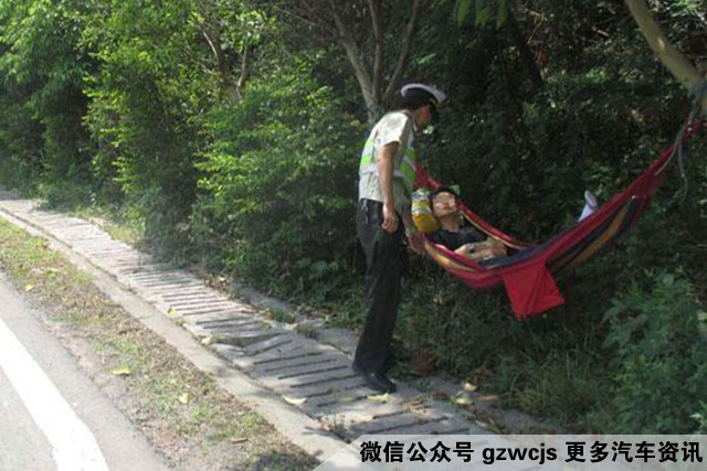 据市交通行政执法总队高速公路二支队四大队执法人员介绍,18日13时20分许,执法人员巡逻至沪蓉高速进城方向巫山马垭口隧道出口时,发现应急车道上停驶一辆小轿车,该车并未开启应急灯,车后也未放置任何警示标志。执法人员上前查看发现,驾驶员居然在路边两棵大树上搭上一张吊床,正呼呼大睡。驾驶员被叫醒之后称,他准备开车回四川,因车辆空调出现了故障,加上中午正犯困,行至该路段时停车准备找个阴凉地方休息,后索性拿出随车携带的吊床安置在路边的行道树上,带上枕头美美地睡着。执法人员对蔡某进行了严厉的批评教育,并依法对其进行了处罚。