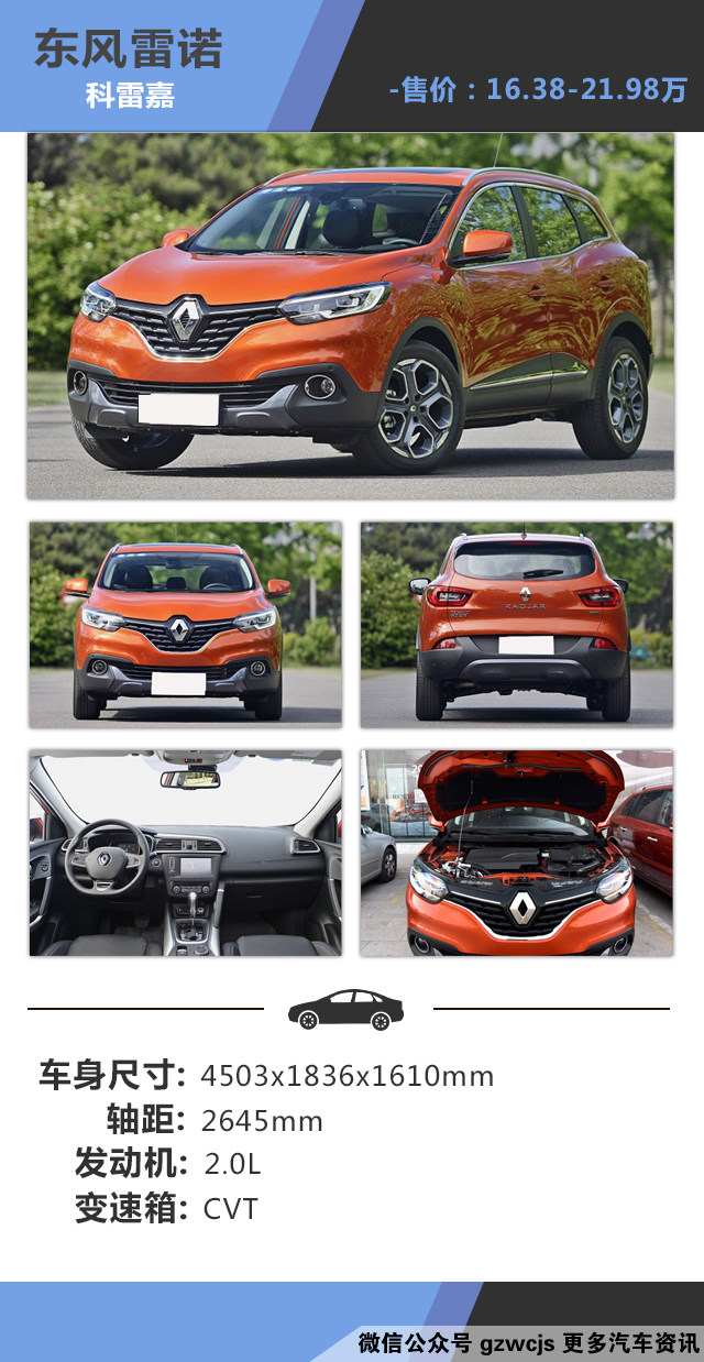 教授点评:雷诺的科雷傲终于国产了,价格亲民了很多,追求个性前卫的年轻人买车的时候又多了一个选择,其个性的外观设计,特别是其硕大的菱形标志极具特色,对于颜色有要求的消费者,无论年轻活力的年轻人还是沉稳的大叔都可以找到你喜爱的配色,内饰方面依然浓郁的法系风情,比同平台的逍客设计好了很多。