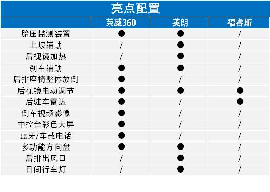 其它配置方面,胎压监测、刹车辅助这类关系到行车安全的配置,荣威360、英朗都做得比较好,福睿斯的配置相对来说寒酸不少,而荣威360不仅价钱更亲民,同时配置也非常丰富,这一点教授认为荣威360做得非常好的。