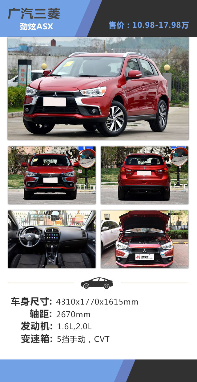 教授点评:新款的劲炫ASX在北京车展上市了,不过目前只有两款车型,可供选择比较少,还好老款的车型还在卖;只是新款的设计,让教授印象深刻的只有两块硕大的镀铬装饰,我是有些接受不了的,不知道大家有没有同感呢,而三菱固其名为家族化设计,不过目前水深火热的三菱设计师真的有时间么?教授还是比较欣赏老款的设计;大嘴的造型不算很突出,不过至少很耐看,至于车内配置教授觉得还是比较简陋的,目前剩下唯一的优点就是起步价很低了,对于一些喜欢三菱的消费者还是可以入手的。