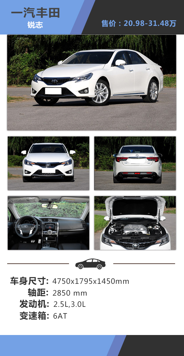 教授点评:锐志这款车型不仅全系标配V6发动机,而且采用前置后驱的驱动形式,其独特高超的运动特性也经常被汽车发烧友所津津乐道,实际上锐志已经上市了3年,因此在价格上还是优惠上会比其余两款更具性价比。