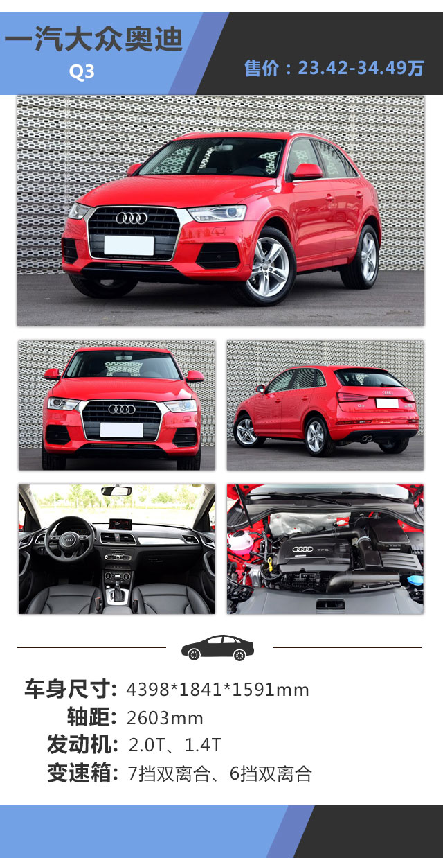 教授点评:Q3是这三款车型中最小的一辆,为什么要推荐这款车呢?教授觉得,或者你可能不需要这么大的车型,那么1.4T的奥迪Q3是很适合你。体型看上去没那么庞大,所以这款车多了一份的时尚感,相信这款车会挺适合潮人去拥有。奥迪Q3的外观内饰相信也不需要教授多讲,还是同样的配方还是同样的味道。动力方面,1.4T匹配奥迪的6速双离合,0-100公里加速只需要9.2秒,因为Q3是三款车中尺寸最少,所以数字并不是那么惊艳,不过大众系的双离合确实做得比较出色,基本上很难找到与之匹敌的同价位双离合。