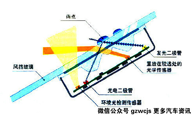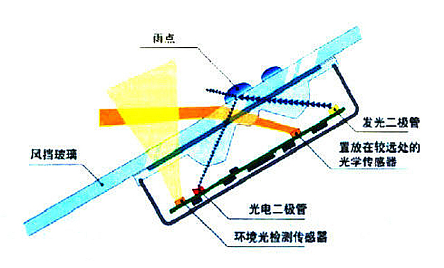 目前应用广泛的传感器分为光学式传感器和电容式传感器。光学式传感器中有一个发光二极管,它发出一束锥形光线,这束光穿过前挡风玻璃。